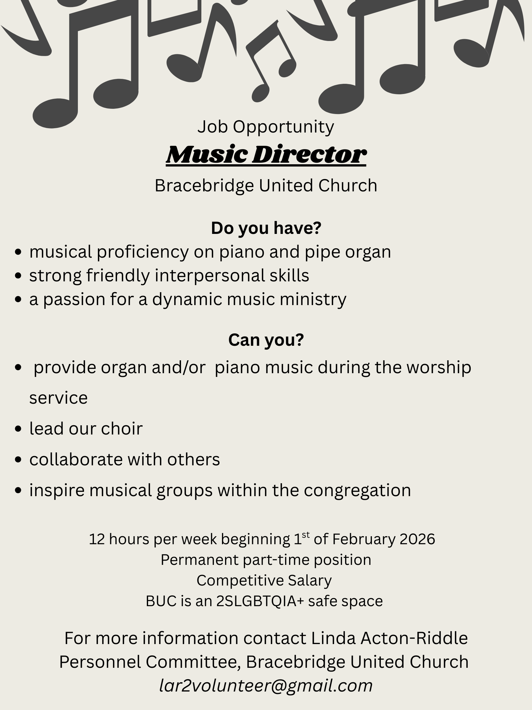 Bracebridge United Church, 46 Dominion St., Bracebridge, is seeking a custodian to begin January 1, 2024. We are an active congregation with many community groups meeting in our centre-town building.